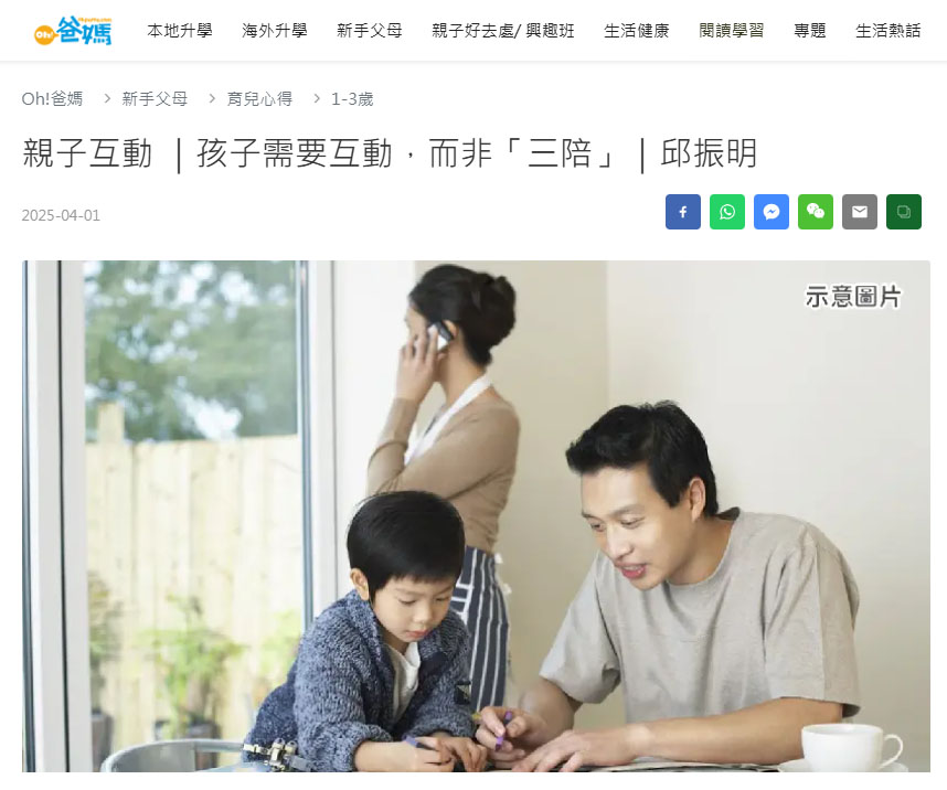 【孩子需要互動,而非三陪】邱振明 「三陪」,即陪食、陪睡、陪玩。「陪」與「互動」有很大不同。「陪」是成人主動去陪伴孩子,孩子是被動的;而「互動」則是雙方都是主動的,彼此參與。孩子即使要在他人旁邊操作物件,也是主動的行為。任何被動的相處,久而久之會變成依賴。如果我們總是陪伴孩子吃飯、睡覺、遊戲和讀書,來補償現代人溝通不足