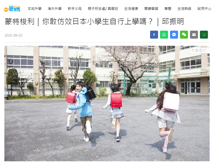【你敢仿效日本小學生自行上學嗎?】 邱振明 2025-09-02 清晨七時,日本小鎮的街角,細雨微微。六歲的孩子背著比身軀還大的書包,與同路的小伙伴一同行進。沿途有高年級生帶領,路口有社區義工守望。在路口的司機早已停車,靜靜等待孩子踏出那一步。沒有喇叭聲,沒有催促,只有孩子看著斑馬線,一步一步,行出獨立。孩子安全行到對面,不忘轉身,向司機鞠躬道謝。這並