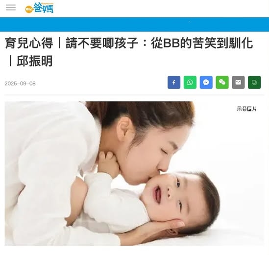 《請不要唧孩子:從BB的苦笑到權力的馴化》 邱振明 香港人有一種「手多」的習慣,特別是見到BB,總愛伸出魔爪,捏一捏、唧一唧,覺得逗小孩笑是人生最大樂趣。街坊姨姨、搭電梯遇上的叔叔,甚至朋友聚會中的「無牌育嬰師」,人人都覺得自己有權利「玩弄」這個小生命。 可是,笑聲並不等於快樂。你若仔細聽,孩子的笑聲裏常夾雜着一種驚惶,一種無所適從的停頓。成人覺得