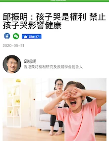 【孩子哭是權利 禁止孩子哭影響健康】思考香港傳媒 邱振明 「有甚麼不開心,就好好哭一場吧!」這句說話人人都聽過,這紓緩情緒的方法也的確有用。