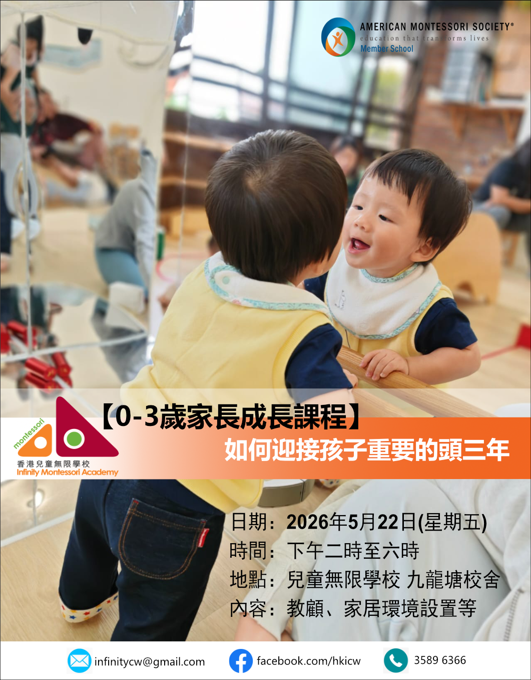 如何與孩子建立融合和依附的關係,同時培養他獨立專注?如何協助嬰兒和天、地、人的秩序融合?如何寓教育於照顧孩子?0-3歲幼兒發展迅速,家長會發覺自己亦要不斷與孩子共同成長,我們會在生命中重要的前三年會更全面更細緻協助你和孩子成長,感覺、動作、語言、個性、情緒和社交得以自然發展。本課程完成【8小時家長基礎課程】 後可選修。 報名及查詢,請電郵infinitycw@gmail.com或致電3589 6366。
